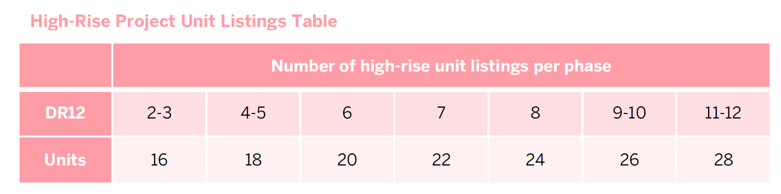 The results indicated on the project listings table will indicate how many listings will be offered in each phase. (Bear in mind that these unit numbers are notional, not precise; they are only meant to lend a measure of the proportions of these project phase listings to the equally notional numbers of retail listings, which stand for one to five listings each.)
