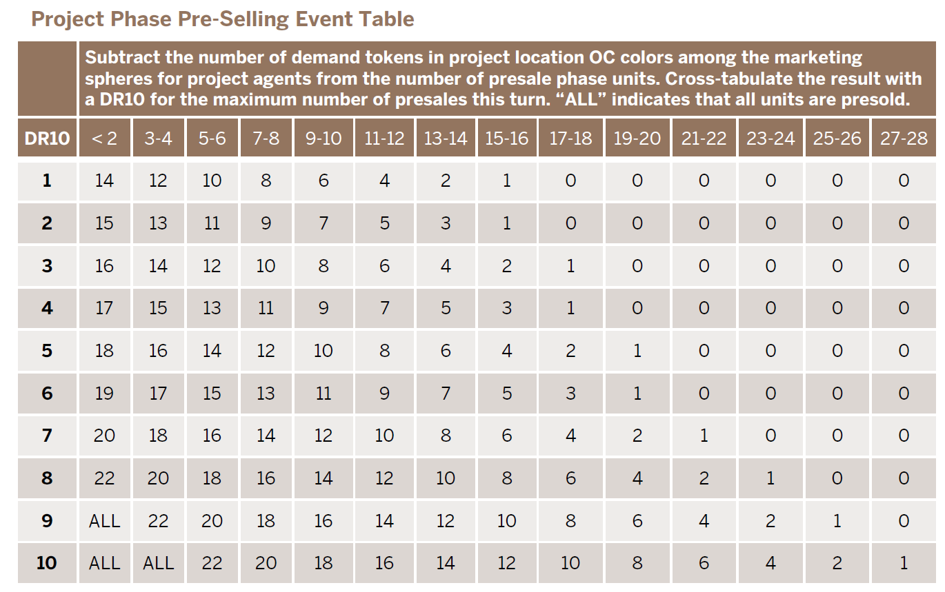Each project is eligible for one mass selling event each turn at the beginning of the Selling Phase. The sales for these events are rolled on the Project Phase Pre-Selling Event Table. The active player begins by counting the numbers of demand tokens of (a) the relevant OCs for that location among (b) all marketing spheres except Homebuilders and the Geographic Farming Box for (c) all agents for that project on the project mat (i.e., those assigned project listings). None of these demand tokens are to be removed from their boxes to fill project sales. This figure is subtracted from the number of units previously determined on the Project Listing Table. The difference is used to find the relevant column based on the ranges in the top row of the Pre-Selling Event Table. A DR10 is rolled on the leftmost column, with the cross-indexed result indicating the number of units sold. This number is indicated using numbered counters on the project mat.