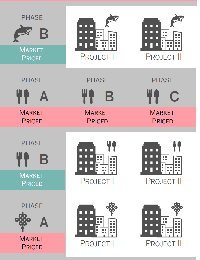 The "Project Construction" counter is then set at the current turn space on the combined records track. The "Project Occupancy" counter is placed 10 turns later (equivalent to two years in real time). The "Phase 1 Presales" counter is placed three turns after the Project Construction counter. When the Phase 1 turn is reached, presales of units begin. The Phase 2 and Phase 3 markers are placed sequentially on the turn following any turn in which the preceding phase's units are completely presold. This means that the earliest a project can be presold is five turns (equivalent to one year) after the project is won. If a project's sales are stalled (i.e., the sales in any phase are not complete by the Project Occupancy turn), the Project Occupancy counter is pushed back by two turns.