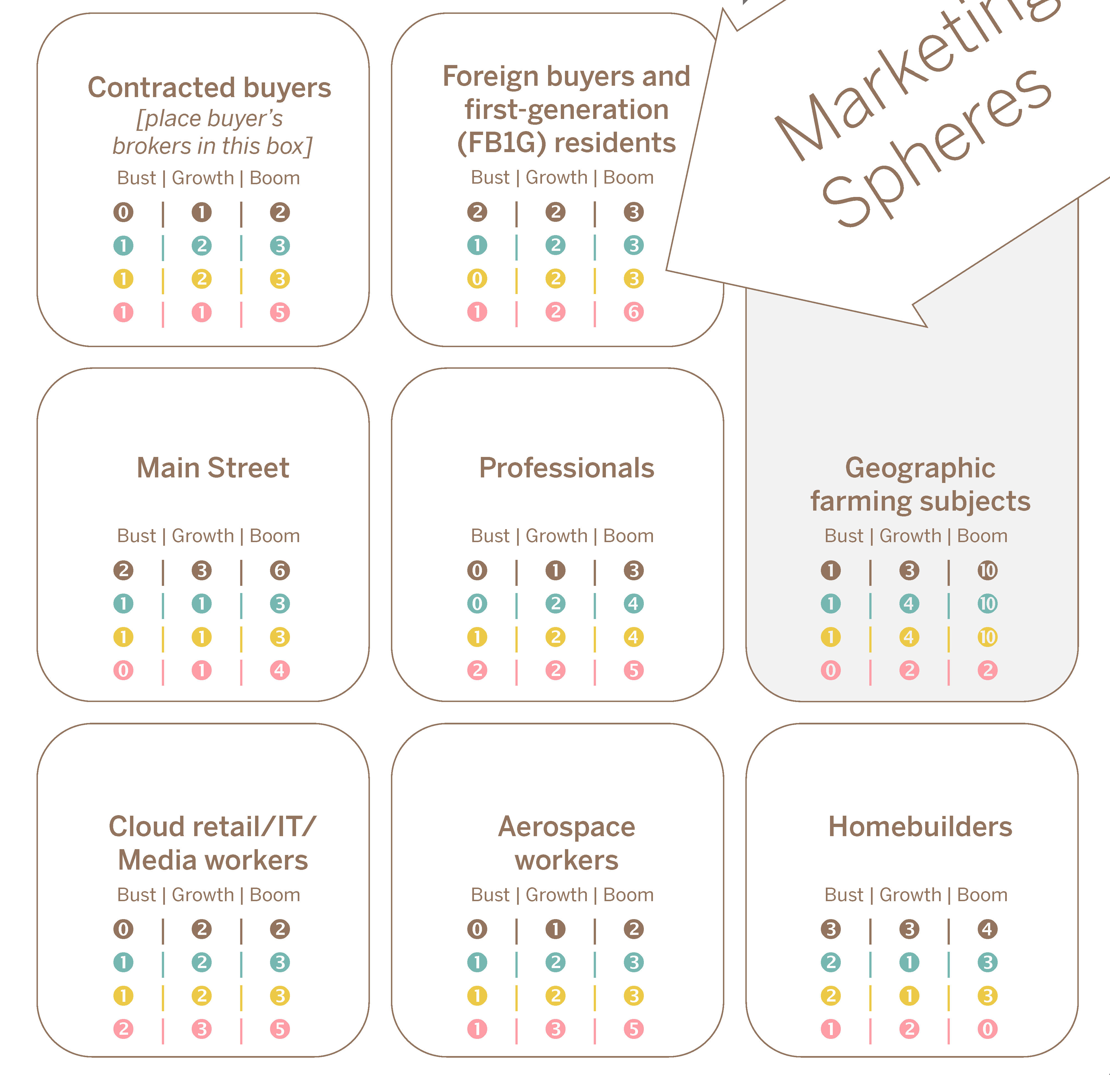 A farming marker in a marketing sphere offers access to sales that are (1) not available through geographic farming and (2) are more resistant to the economic cycle, (3) allows benefits from social media execution, (4) helps to win project unit presales, and (5) allows that agent to receive visibility and influence points related to those project sales. It also somewhat increases the risk presented on some card event plays.