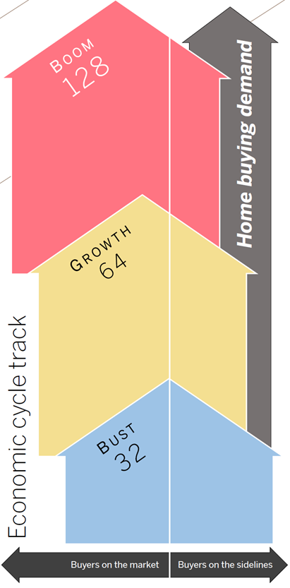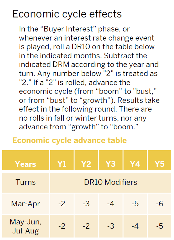 The economic track performs several key functions: to mark and summarize the current economic conditions influencing home selling markets; to calibrate the number of listing and selling opportunities available per turn, as well as fulfilled or sidelined demand; and to provide a vehicle for enacting the effects of certain event card plays. Current conditions are indicated by an economic cycle marker that is moved from one phase to the next based on the outcome of a die roll on the Economic Cycle Advance Table.14