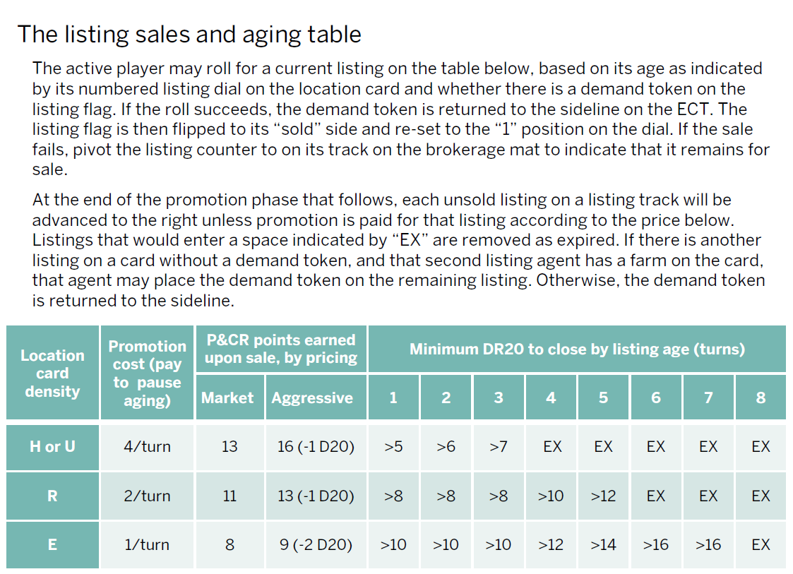 During the Selling Phase, the player rolls a DR20 (the sum of two ten-sided dice) for each listing based on its position on the listing agent’s listing track, comparing the result to the same numbered column on the listing sales and aging table. The dice roll may be subject to modification by events, or by aggressive pricing of that listing based on which side of the listing counter is face up. As shown in the “aggressive” column under “P&CR points earned” on the listing sales and aging table, aggressive pricing causes a -1 DRM22 in H, U, and R locations, and a -2 DRM in E locations.