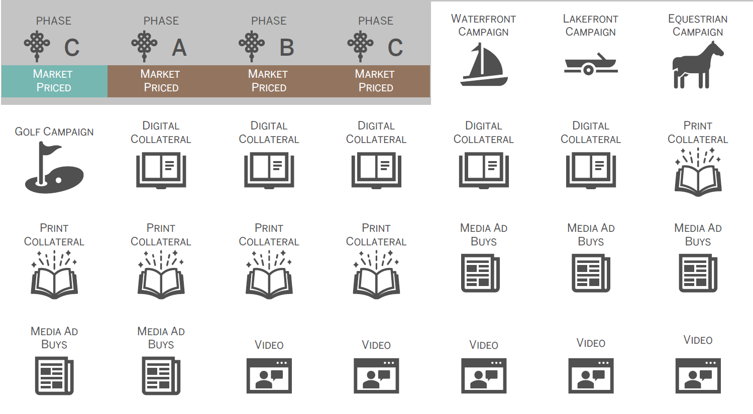 To promote a listing normally, a player must pay the promotional cost shown on the listing sales and aging table. However, promotional event cards allow one promotional fee to be paid for a limited number of listings on location cards with certain amenities, like waterfront, equestrian, and golf properties. If these events are played, a marker to that effect is placed on the office card. Together with listings for which the player pays promotion individually, all relevant listings on that player’s brokerage card and up to five listings of other players in locations that feature those amenities may avoid being advanced at the end of the Promotion Phase by paying four P&CR points for all.